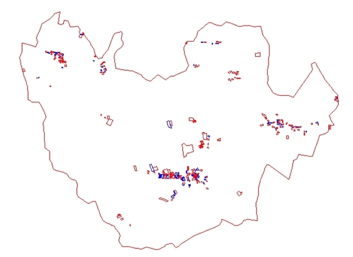 En rouge, les bâtiments analysés ; en bleu, les bâtiments non analysésImmatriculation
