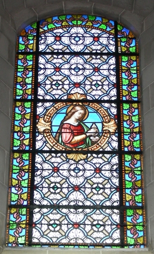 Ensemble des verrières des baies 1 à 5 : Bon Pasteur, Notre-Dame du Sacré Coeur, Saint Maur ?, Apparition du Sacré-coeur à sainte Marguerite-Marie, Sainte Marie-Madeleine,