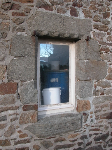 3ème logis, détail, fenêtre avec appui mouluré et linteau à boules, croix gravéeImmatriculation