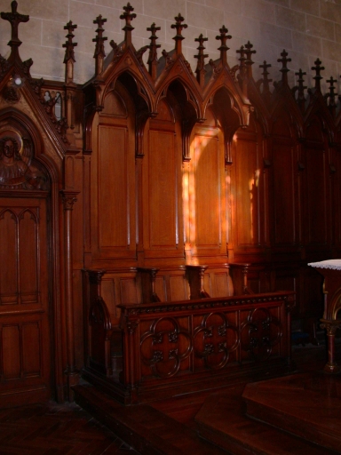Décor de choeur : lambris de revêtement, 2 bancs de choeur, bas-reliefs,