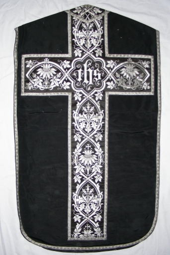 Ornement noir 2 : chasuble, voile de calice, manipule, étole et bourse de corporal,