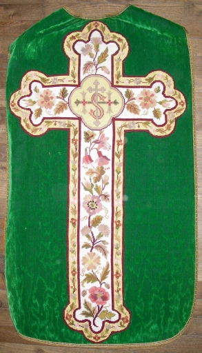 Ornement vert : chasuble, bourse de corporal et manipule,