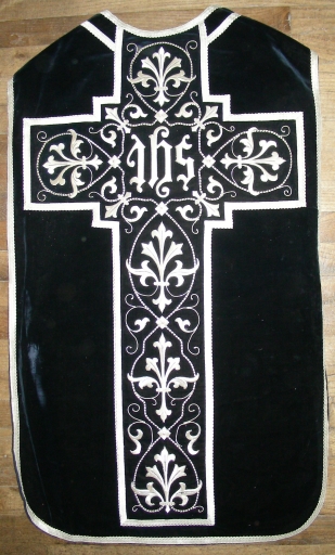 Ornement noir : chasuble, bourse de corporal, manipule et étole,