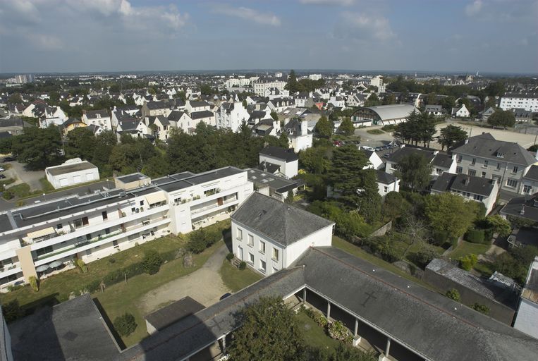 Vue du presbytère et du cloître prise du clocher de l'église.Immatriculation