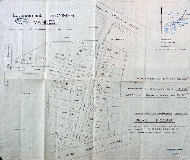 Plan modifié du lotissement Sommer dressé par Xavier Lunven et daté du 28 juillet 1953. AM Vannes 1O221.Immatriculation
