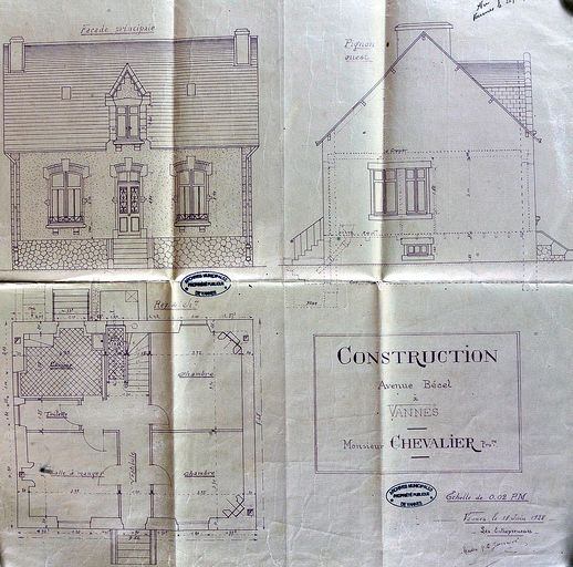 Plan et élévation de la façade antérieure de la maison de monsieur Chevalier par les entrepreneurs Madec et Le Guernevé dressés le 18 juin 1928. AM Vannes 5I162.Immatriculation