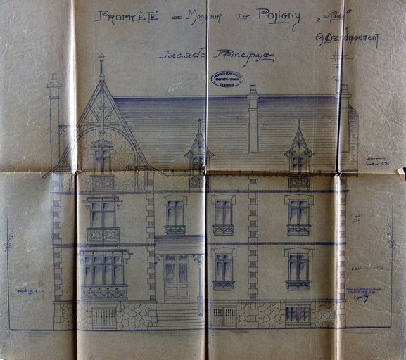 Projet d'agrandissement : élévation de la villa pour monsieur Quirot de Poligny par E. Gemain datée du 31 juillet 1911. AM, Vannes 5 I162.Immatriculation