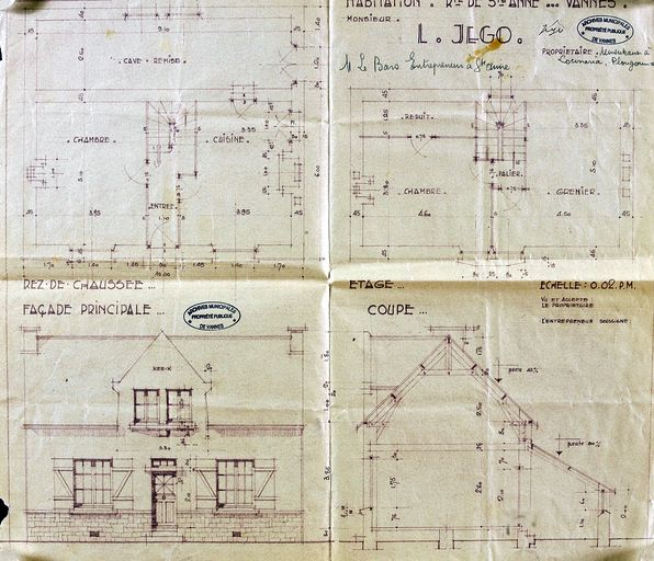 Plan de la maison L. Jego par Le Bars entrepreneur de Sainte Anne d'Auray. AM, Vannes 5I162 casiers sanitaires.Immatriculation