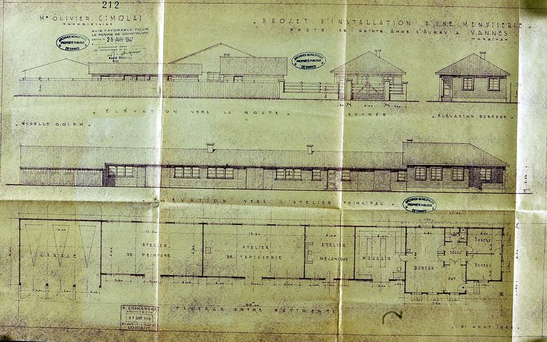 Elévation et plan au sol de la menuiserie Cimolaï par Grihangne, 1946. AM Vannes 1G59.Immatriculation