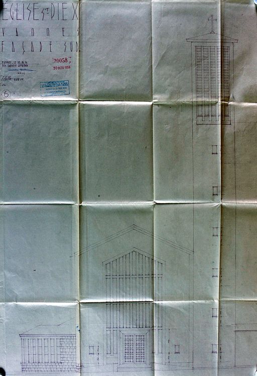 Façade sud de l'église Saint-Pie X par G. Caubert de Cléry, 16 août 1956. AM Vannes 1G59.Immatriculation