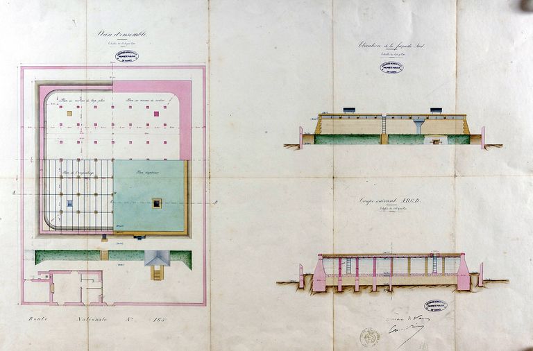 Plan au sol, élévation et coupe du réservoir par Edmond Bassac, 1891. AM Vannes 3N209.Immatriculation