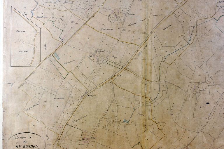 Plan cadastral 1844 : section I Bondon 2e feuille, chemin de Vannes à Plescop. AM Vannes 21Fi.Immatriculation