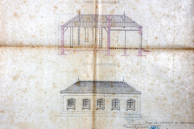 Pavillons latéraux, gymnase, logement du concierge et école d'application. Plans et élévation, signé de Maigné, daté 1881 : détail partie centrale. AD Morbihan, N 757.Immatriculation