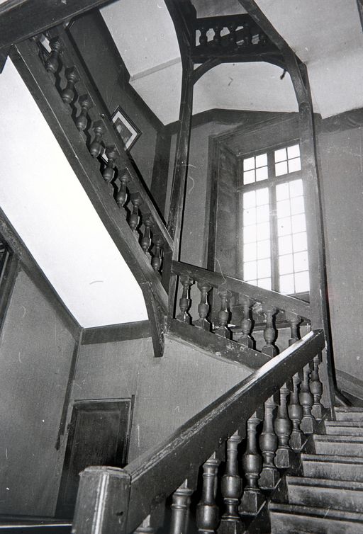 Vue de la cage d'escalier du château du Pargo. Photographie par P. Thomas-Lacroix vers 1975. AD, Morbihan 3Fi262/792.Immatriculation