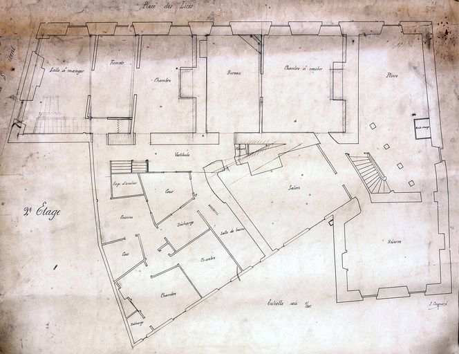 Plan d'aménagement de l'imprimerie Lafolye par Joseph Caubert de Cléry pour M. Jacquet, novembre 1909-1910 : second étage. AD Morbihan 149 J 296.Immatriculation