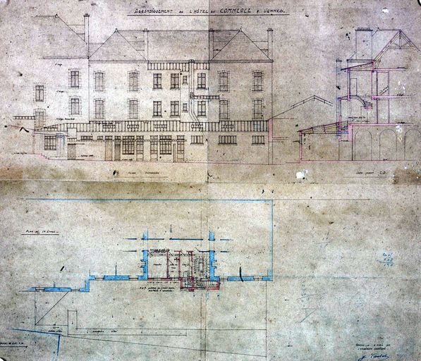 Projet d'agrandissement de l'hôtel : élévation sud. Dessin par Joseph Caubert de Cléry pour Mme Delory, 4 avril 1925. AD Morbihan 149 J 276.Immatriculation