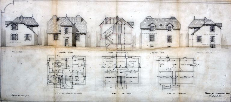 Projet pour la maison du sacristain par Joseph Caubert de Cléry : plans, coupes, élévations, 9 novembre 1926. AD Morbihan 149 J 255.Immatriculation