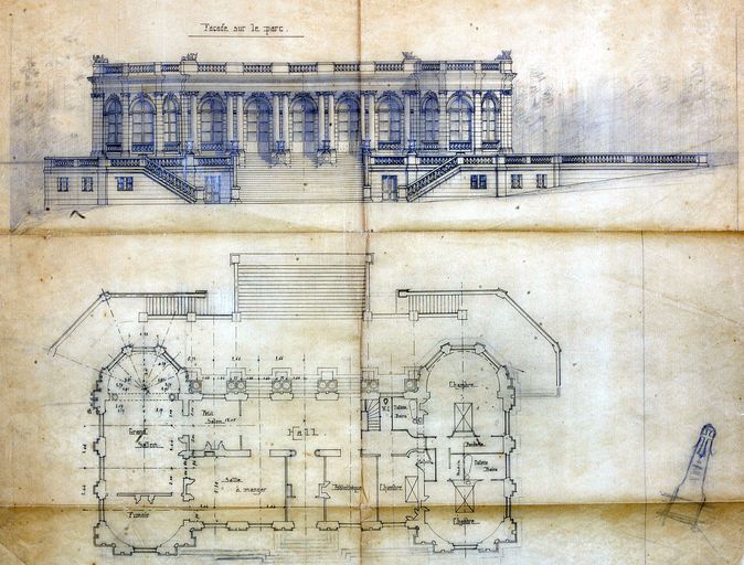 Premier projet pour la maison Douaud par Joseph Caubert de Cléry : élévation sur jardin, 1919. AD Morbihan 149 J 358.Immatriculation