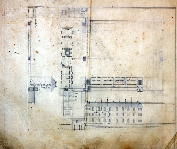 Plans et élévations d'un bâtiment d'école et internat pour le lycée de Ménimur par Joseph Caubert de Cléry, 1925. AD Morbihan 149 J 264.Immatriculation