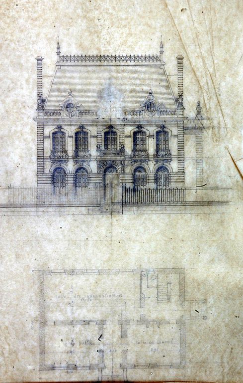 Construction de la Caisse d'Epargne par J. Caubert, 1914 : élévation sur la place. AD Morbihan 149 J 290.Immatriculation