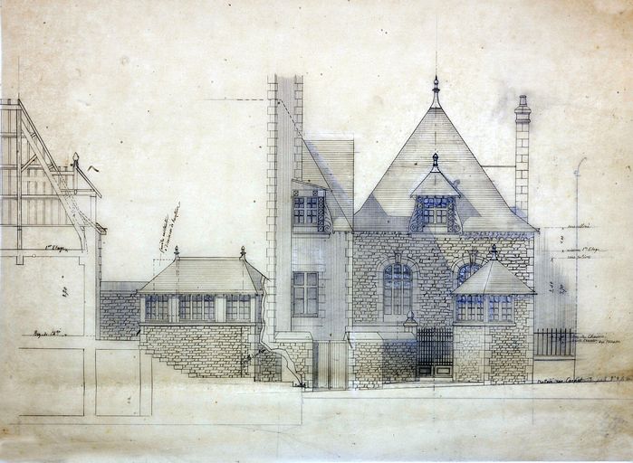 Modification de la façade par J. Caubert, 1927-1928 : élévation sur la rue Carnot et coupe. AD Morbihan 149 J 361.Immatriculation