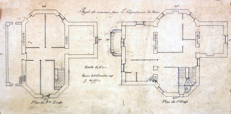 Construction d'une maison pour le capitaine de Brun par J. Caubert de Cléry, 1898 : plan des étages. AD Morbihan 149 J 346.Immatriculation