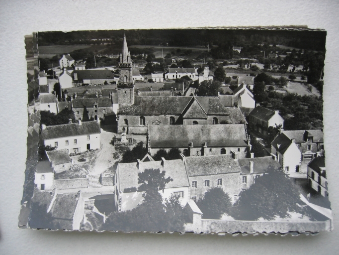 Bourg, vue aérienne sud. Carte postale Lapie, vers 1950. AD Morbihan, 5 Fi.Immatriculation