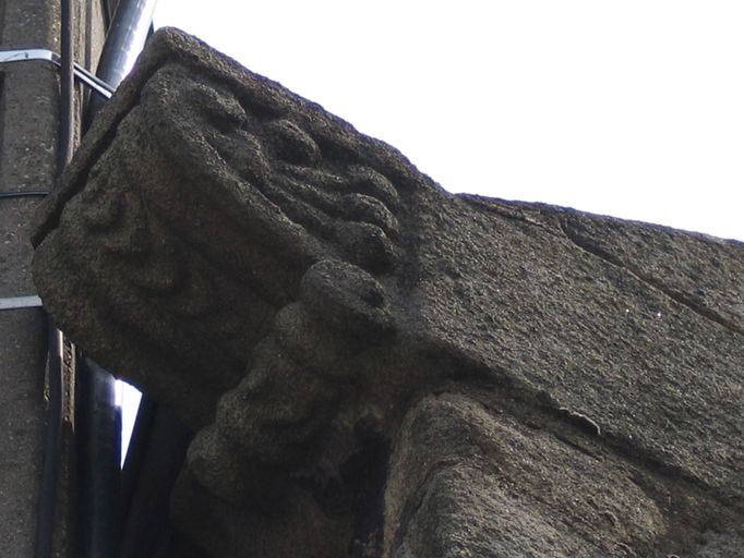 Elévation antérieure, détail de la crossette de rampant nord-ouest.Immatriculation
