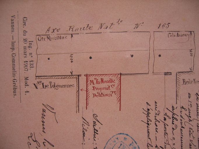 Demande de Le Fèvre, entrepreneur, pour construire une maison pour Le Moellic rue d´Auray, 1er juin 1908. AD Morbihan S 247.Immatriculation