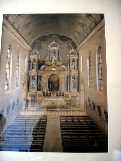 Vue intérieure vers le choeur et le retable disparu. Gravure, fin 19e siècle, Collection privée.Immatriculation