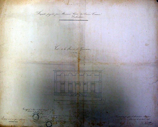 Plan des trois façades par Marius Charier : façade rue de la Garenne. Litige entre l'architecte et la ville à propos de l'emmarchement rue de la Garenne. Août 1845. AM Vannes 1O 216Immatriculation