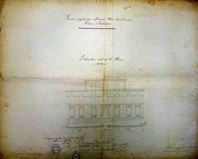 Plan des trois façades par Marius Charier : façade place du Féty. Litige entre l'architecte et la ville à propos de l'emmarchement rue de la Garenne. Août 1845. AM Vannes 1O 216Immatriculation