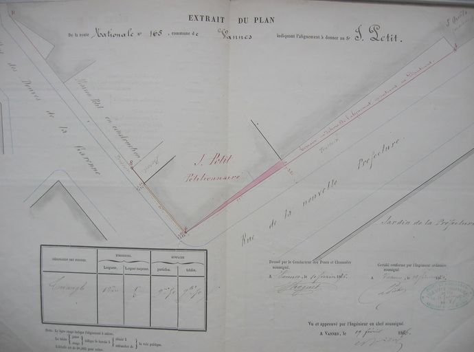 Extrait du plan de la RN n°165 indiquant l'alignement à donner au Sr Jean Petit, 1876. AD Morbihan S1210 (RN 165).Immatriculation
