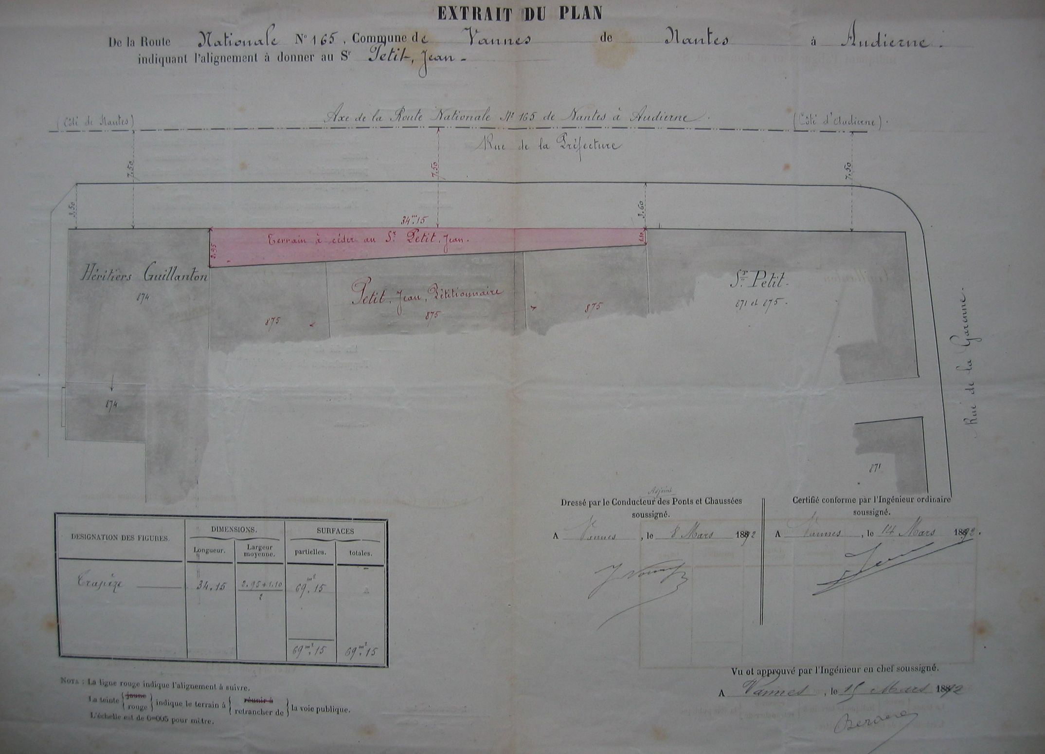 Extrait du plan de la RN n°165 indiquant l'alignement à donner au Sr Jean Petit, 1892. AD Morbihan S1210 (RN 165).Immatriculation