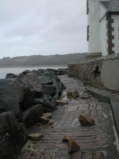 Vue de l'état du sentier devant le phare : remarquer la brèche dans le mur de clôtureImmatriculation