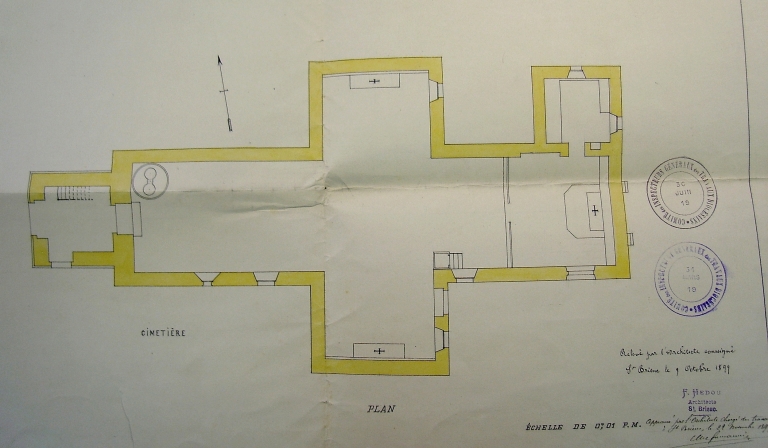 Plan au sol de l'ancienne église paroissiale Saint-Sieu, par l'architecte F. Hédou, le 9 octobre 1899 (AD 22)Immatriculation