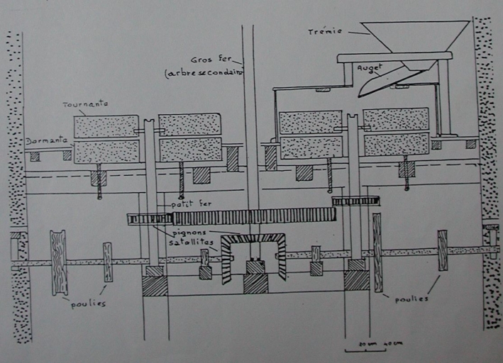 Détail : coupe du moulin avec le mécanisme général d'un moulin à vent (dessin de Jean Peillet)Immatriculation