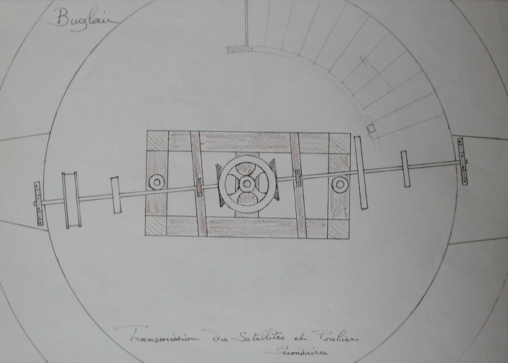 Système de transmission des satellites et poulies secondaires (dessin de Jean Peillet)Immatriculation