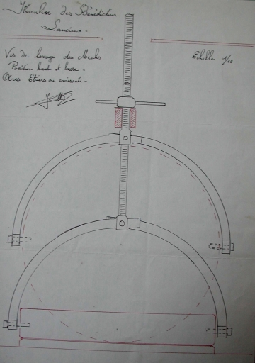 Vue du système de levage des meules, avec arcs, étriers ou croissants : position haute et basse (dessin de Jean Peillet)Immatriculation