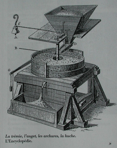 L'équipement du tournant : la trémie, l'auget, les archures, la huche (dessin de l'Encyclopédie, G. Pouliquen)Immatriculation