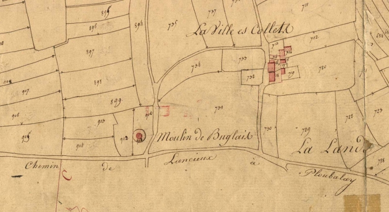 Extrait du cadastre de 1827 : situation du moulin de Buglais, section B (AD 22)Immatriculation
