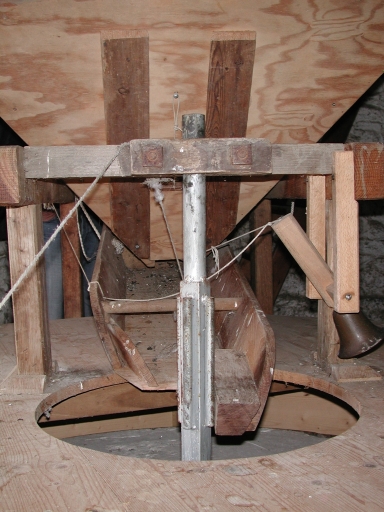 Vue de l'auget, de la clochette et du petit fer actionné par un feuillard : système d'alarme du meunier pour alimenter ne grains la trémieImmatriculation