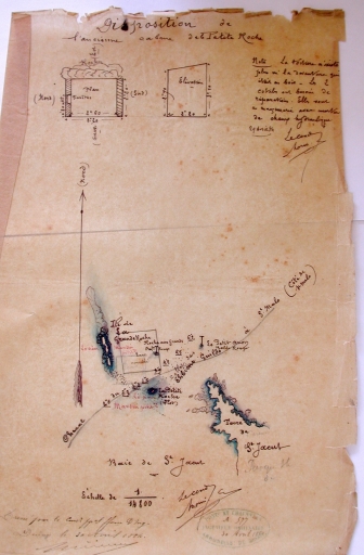 Plan de situation de la concession ostréicole accordée à Alphonse Martin, entre Petite Roche et Grande Roche, 1884, avec le plan des 2 maisons de gardiens des parcs (AD 22)Immatriculation