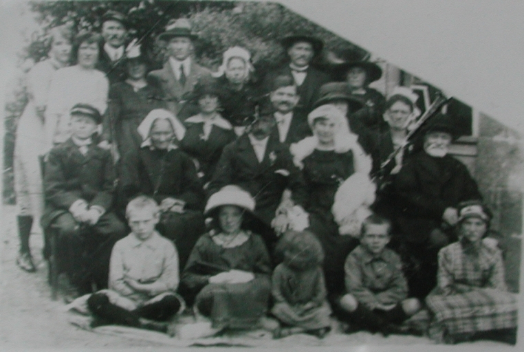 Photographie de Jeanne Aubin (Jeanne Lejour), dite 'Jeanne des Parcs', en famille à Carnac, 1919 : remarquer les coiffes du Morbihan (collection particulière)Immatriculation