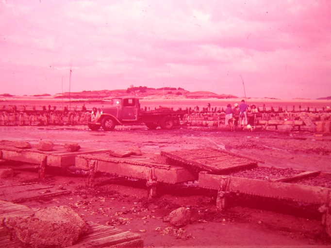 Le travail sur les parcs à moules, au début des années 1950 : remaquer les tables de tri des coquillages (collection particulière)Immatriculation