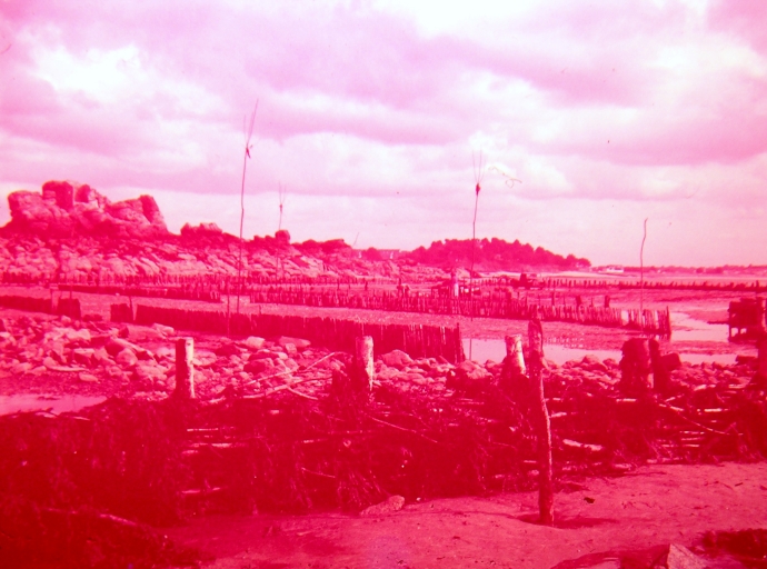 Mise en oeuvre des bouchots en fascines, en suivant le linéaire des anciennes pêcheries ou écluses, vers 1955-56 (collection particulière)Immatriculation
