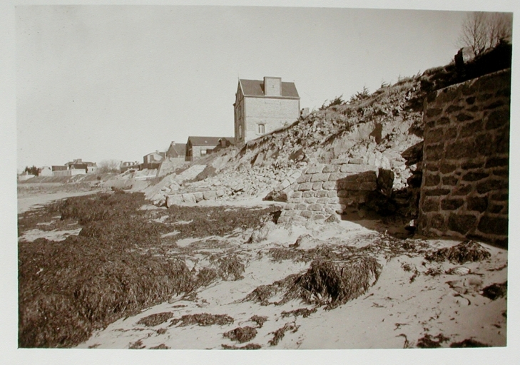 Vue de la digue effondrée, section ABC : remarquer l'érosion de la dune par la mer, le mur a persu son point d'appui (AD 22)Immatriculation