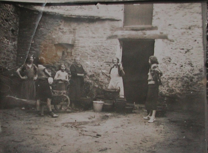 Groupe de mareyeuses et de pêcheuses à pied, dont Yvonne Aubin (au centre), mareyeuse et Marguerite Botherel, vers 1930, au Chef de l'Isle, à St-Jacut (collection particulière)Immatriculation