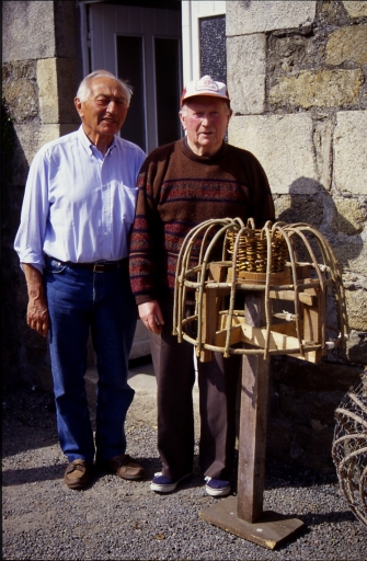 Pierre Aubin et Roger Goupil devant le gabarit de fabrication de casiers à homards, en 1986 pour la fête du patrimoine maritime local (collection particulière)Immatriculation