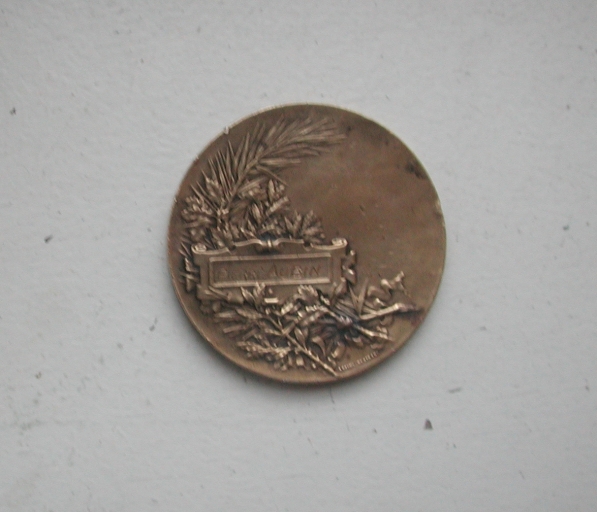 Vue du verso de la médaille, obtenue en régate par Pierre Aubin en 1930, avec son nom gravéImmatriculation